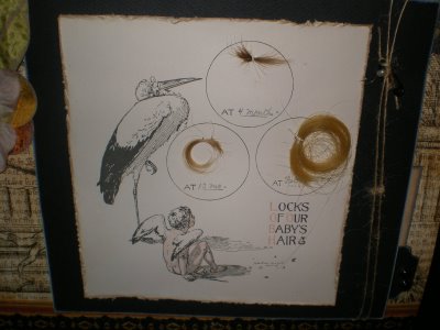The next layout is from a class that the very talented Christie taught at PSB and was the perfect layout for the baby picture of my mother-in-law . . . in preparing these layouts for her memorial service I ran across a copy of her birth certificate (which I shrank down and placed behind the fame) and a loose page that had snippets of her hair . . . soooooo of course I had to included it . . .