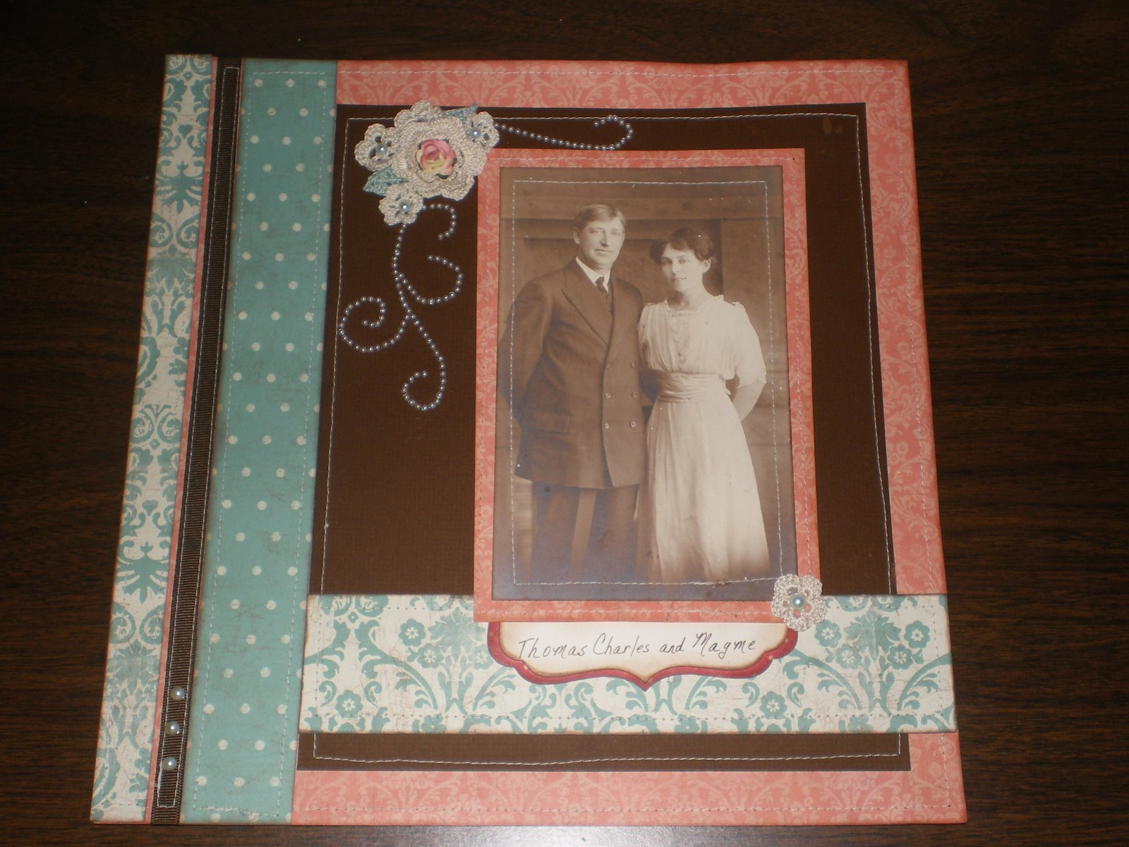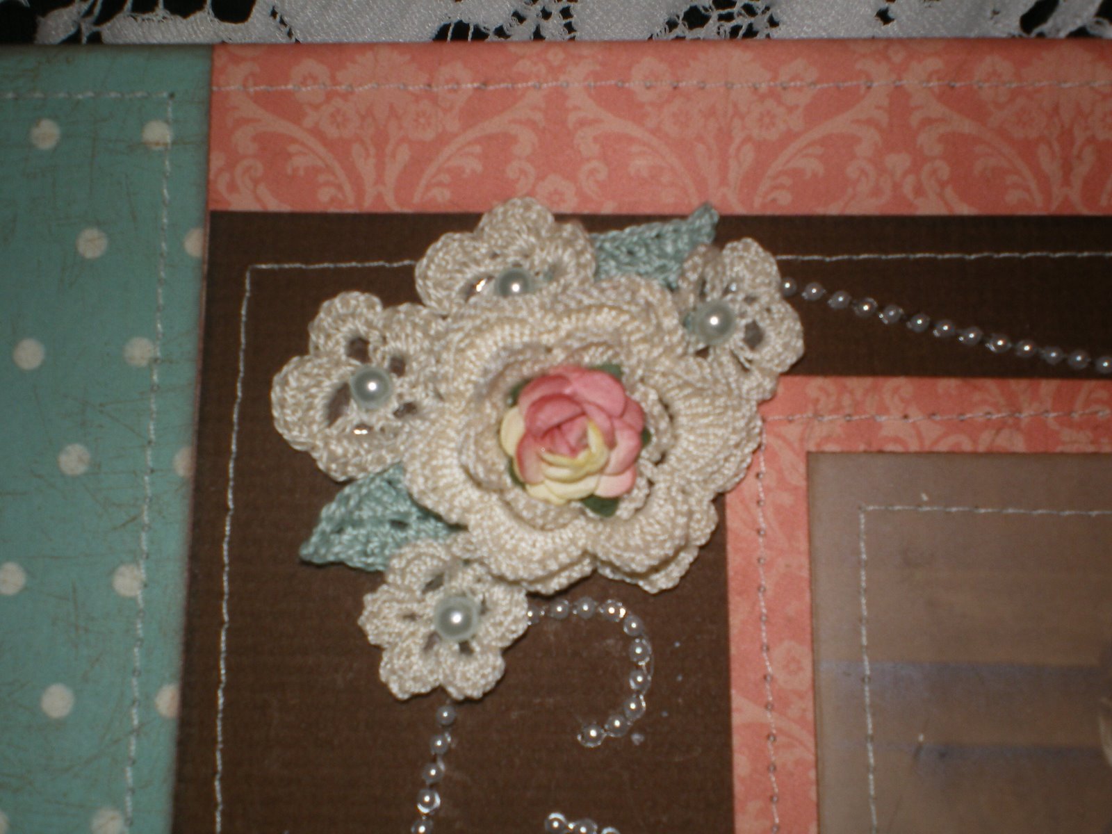 This layout inspired me to try sewing on paper for the first time using my sewing machine (I had previously done all needlework on layouts by hand) . . . it also inspired me to use crocheted flowers instead of the stickers I had purchase . . . however, I couldn’t find the color or sizes of flowers that I wanted . . . sooooooo . . . one night I decided to look through all my craft stash (it really pays to never throw things away) to see if I had any books on crocheting flowers . . . and lo and behold I did (hubby was not surprised) . . . at first I just made single flowers but then I ran across a pattern for making a three layer flower and another pattern for crocheting leaves . . .