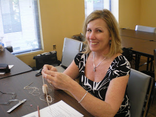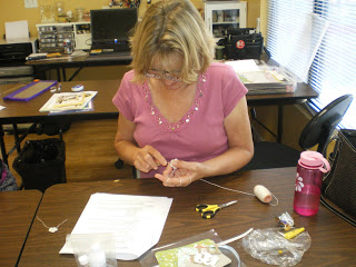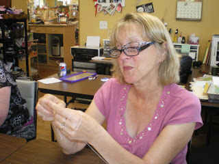 A big THANK YOU to the three very brave ladies who showed up on Saturday, May 9th to take my crochet flower class at Paradise Scrapbook Boutique (this was the first time I ever taught a crocheting class). Everyone was given the patterns for making a single crochet flower (beginner); a triple crochet flower (intermediate) and a leaf (advanced) . . . Karen and Christie learned to make at a single crochet flower (it had been quite some time since they last crocheted) and Barbara made not only a single crochet flower, she also made a triple crochet flower . . . WELL DONE LADIES!!! . . . here they are busy crocheting . . .