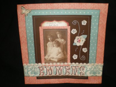This has been a very low key, laid-back Memorial Weekend at my house this year . . . instead of the usual trying to crowd a week into a 3-day weekend with activities or visiting relatives . . . my hubby and I decided the take it easy and just hang around the house . . . so after all the house cleaning chores were done I found some time to do a little scrapbooking . . . I finally completed the second page of a 2-page layout I was doing regarding my mother-in-law . . . so here is “page 2” of the Emmens layout . . . this is a picture of the “daughters of the house” – Elizabeth (my mother-in-law) is the oldest. . . Hope (who died shortly after this picture was taken) is in the middle and Faith (the toddler) . . .