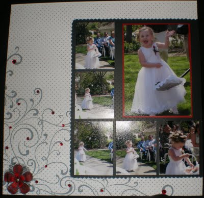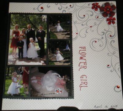 Back in April of this year my granddaughter was the flower girl at her uncle Josh’s wedding (that’s her dad’s brother – no relative of mine) . . . after trying out a number of background papers I finally decided to just keep it “simple” so that the pictures didn’t get lost in the paper . . . I used the new Making Memories wedding overlay, backing it with just plain white paper and adding a little bling to some of the scrolls . . .