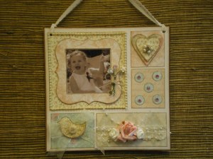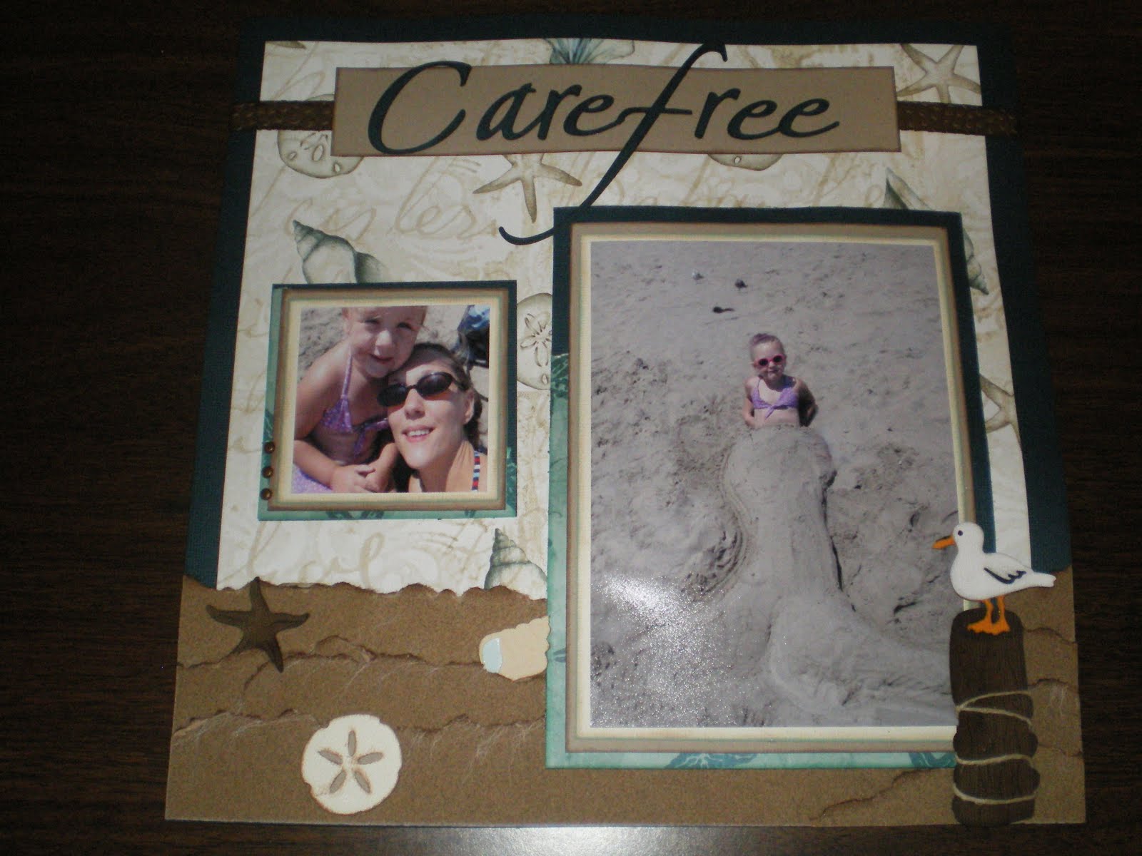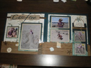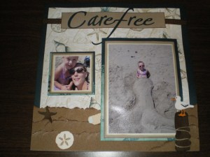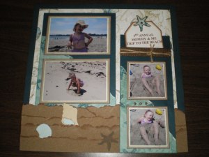 The next layout I am sharing is of pictures of my daughter and granddaughter from their annual “mommy & me” beach trip to Santa Cruz, California . . . this layout was from a kit I purchased at Magic Moments & Keepsakes in Chico and was designed by Stephanie Southam who also happens to be a Close to my Heart consultant . . . as is usual I didn’t follow her design exactly . . . instead of using beige paper for the “turf” on the beach I used regular old sandpaper from my husband’s workshop . . . I think it makes the beach look more sandy, don’t you . . .
