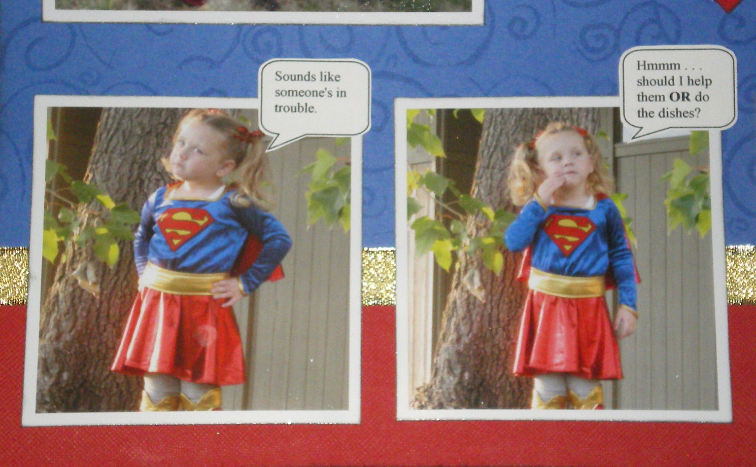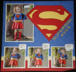 I finally finished this year’s Holloween layout of my granddaughter. Kyra had been saying for months and months that she wanted to be a princess for Holloween this year . . . I don’t know what happened when she went shopping with mom for her costume but she couldn’t wait to show me that she was going to be SUPERGIRL this year . . . well needless to say that began my search for the right shade of colors to go with such a bright costume . . . who knew that there were so many different shades of basic blue, red and yellow . . . sooooooooo . . . at this time I would like to present SUPERGIRL KYRA . . .
