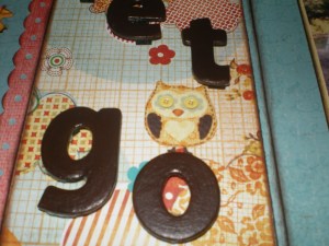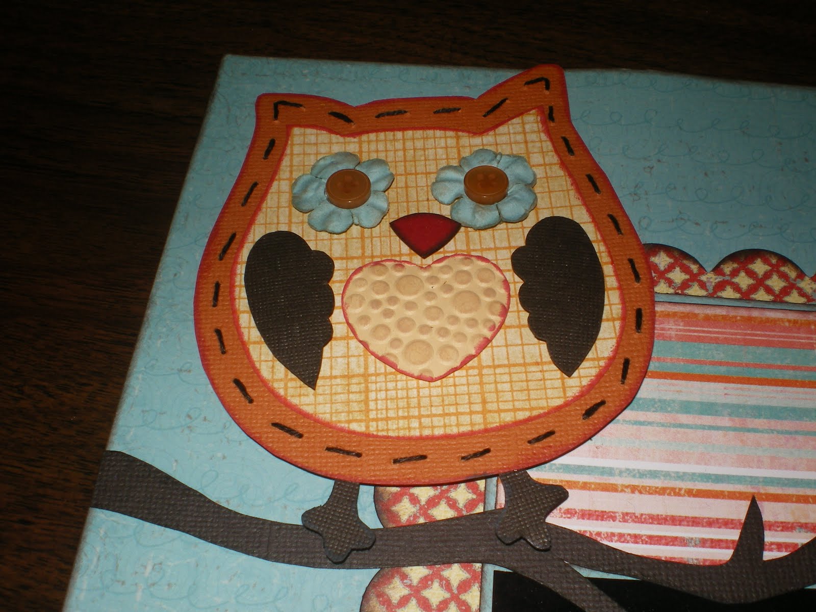 Inspiration for making the owls for this layout came from the paper itself . . . the owl below that was used on the layout came from a kit I purchased at Magic Memories & Keepsakes way back in May 2008 (only made the owl & used the strip of owl paper from that kit) and it had to be pieced together . . . and yes I did actually sew a running stitch around the edge of the owl . . . I decided to make a couple of baby owls for the second page of the layout – with one of them taking flight . . .