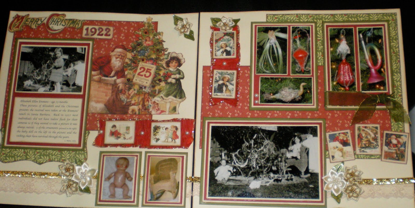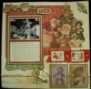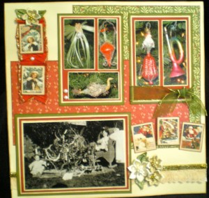 Christmas in February? . . . Why Not! . . . s000000 I know everything is suppose to be all “hearts and flowers” this month but I work at a little slower pace than the rest of the world . . . soooooooo here is a picture of the layout that I completed in January (which was just yesterday) of a Christmas both in the past and in the present . . . my good friend Christie designed this layout for a class at PSB and when I saw it I knew exactly what pictures would go on it . . . and of course being me I made a few changes from Christie’s original layout . . . like I used cream cardstock for the background instead of the original green and as I seem to be going through a glitz period I added glitter glue all over the place . . .