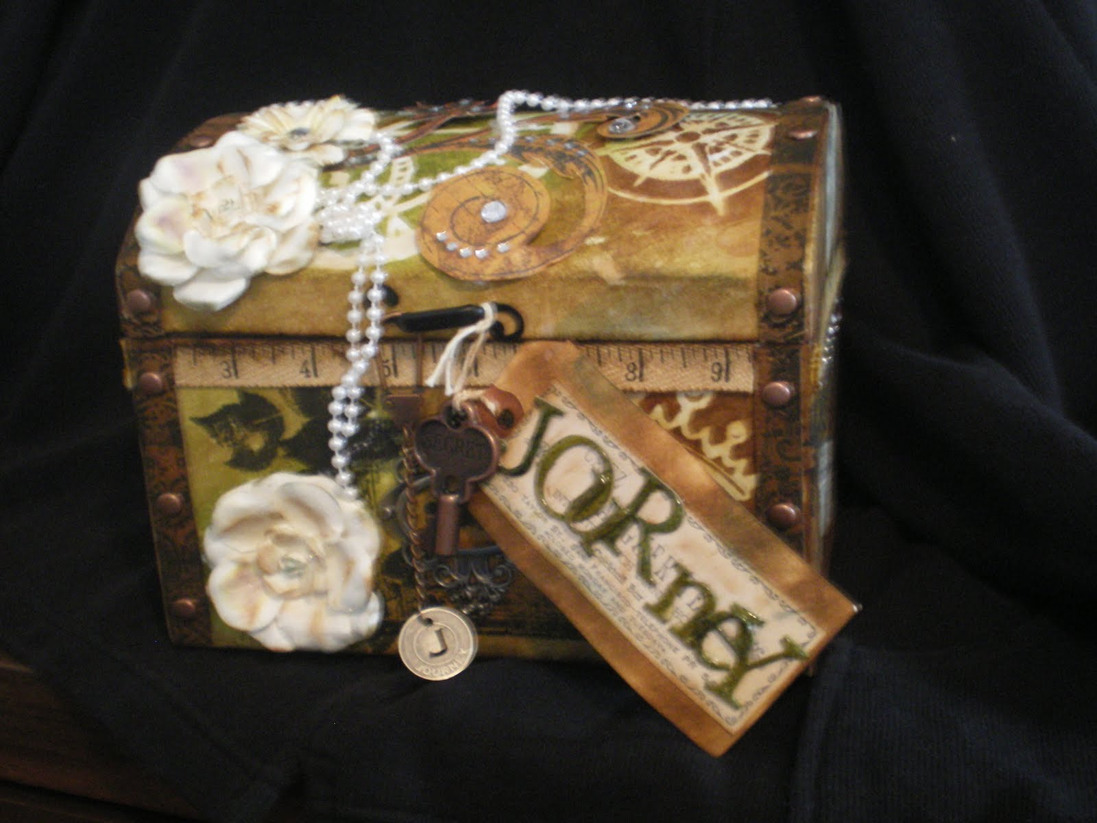 and here is a picture of the altered box that I created on Saturday (I still have to complete the mini album & 3 trading cards) . . . I am still amazed that this treasure box started out as an “all white” box with a pile of papers, inks & do-da’s next to it on the table . . .