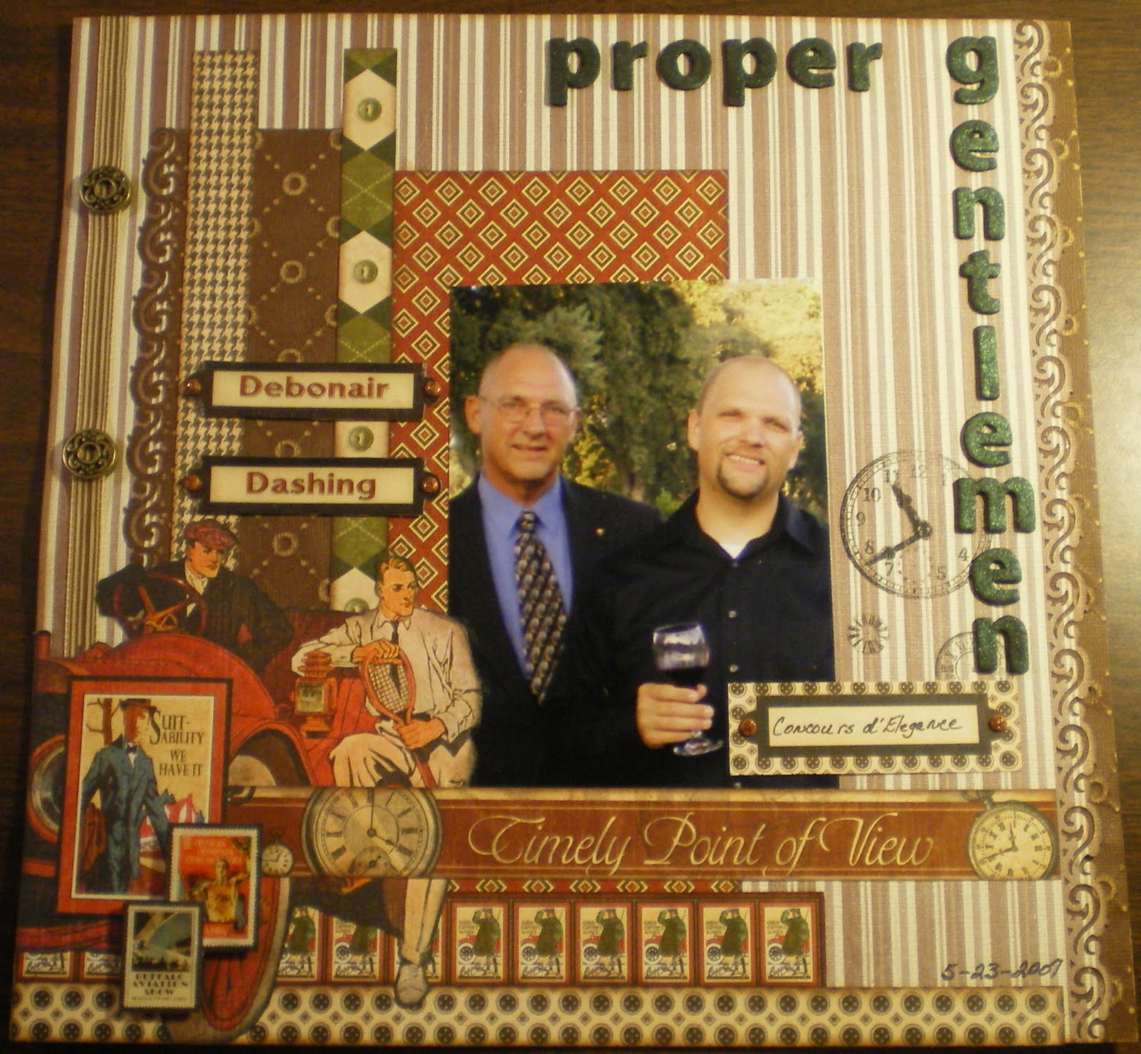 Do you ever have a beloved photo that you are waiting for just the right paper/layout to inspire you . . . well I was and it took three years but boy when I saw a layout created by Irene Tan (aka Scapperlicious) for “The Crop Spot” I knew that what she had created would be perfect for a photo I had of my beloved “boys” (my dear husband and son) . . . even the name of the paper collection was perfect – Irene had used Graphic 45’s “A Proper Gentleman” collection!