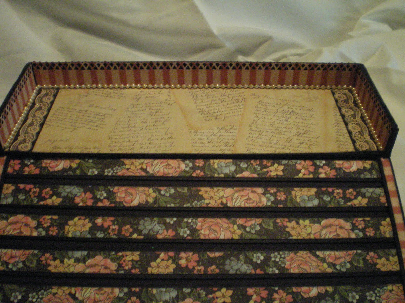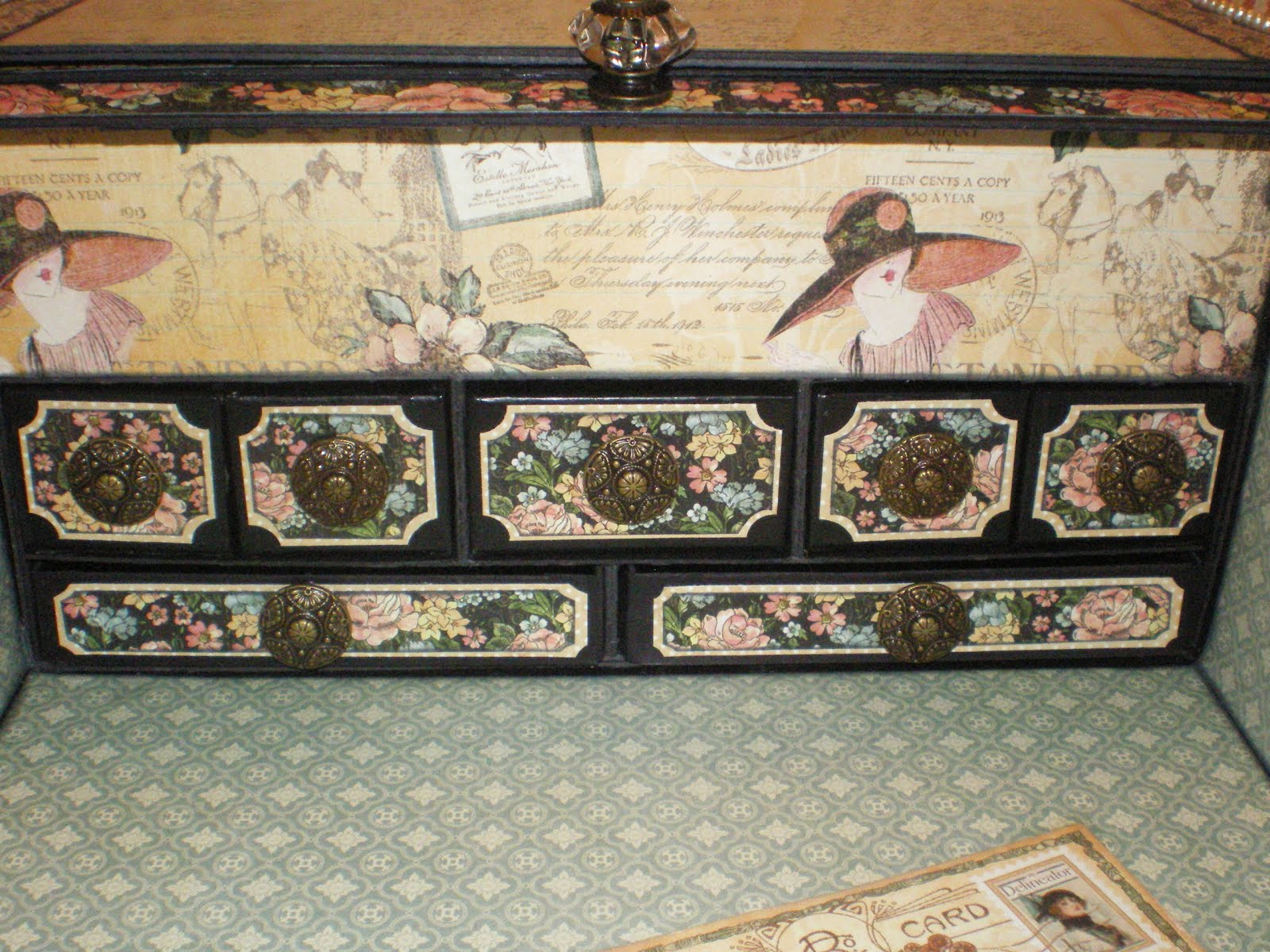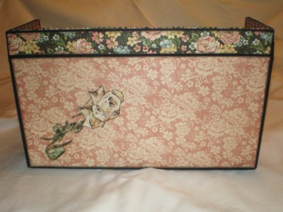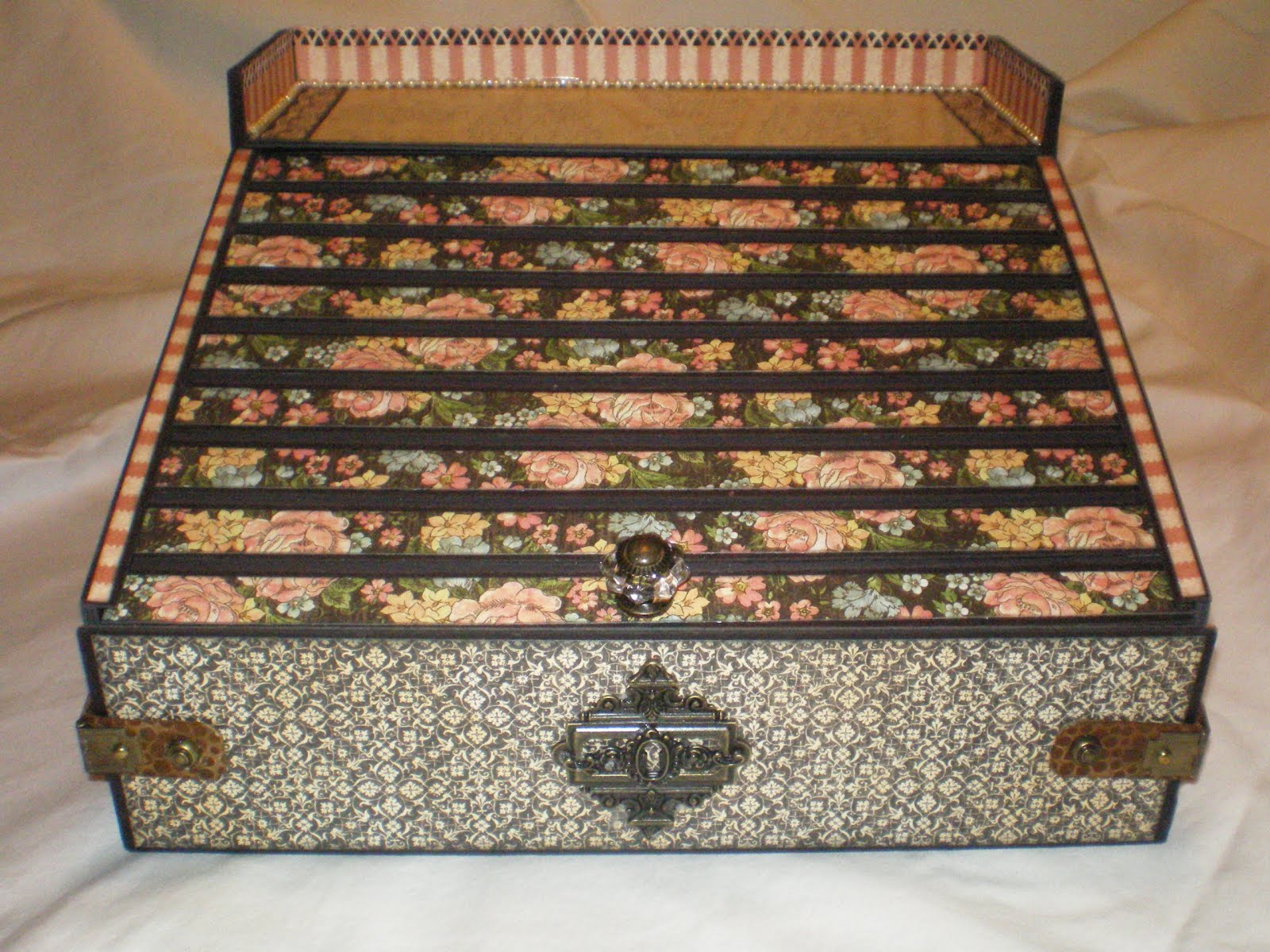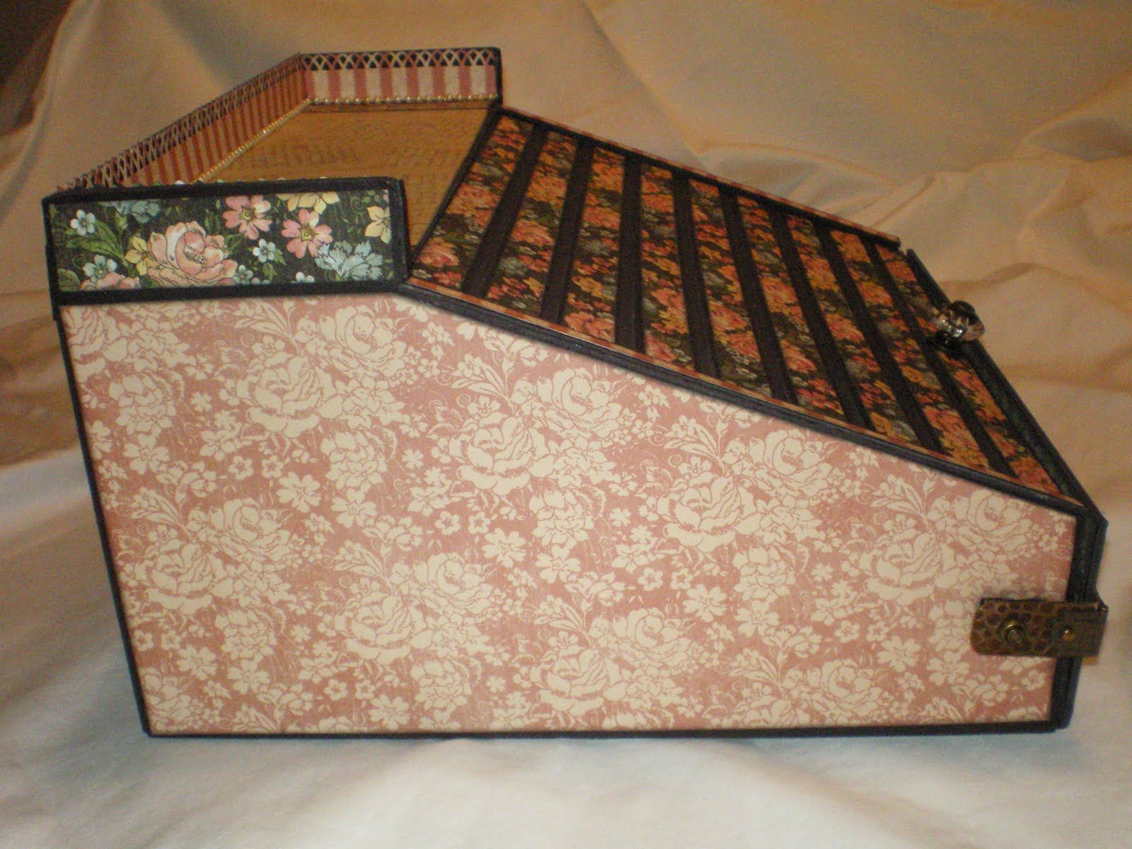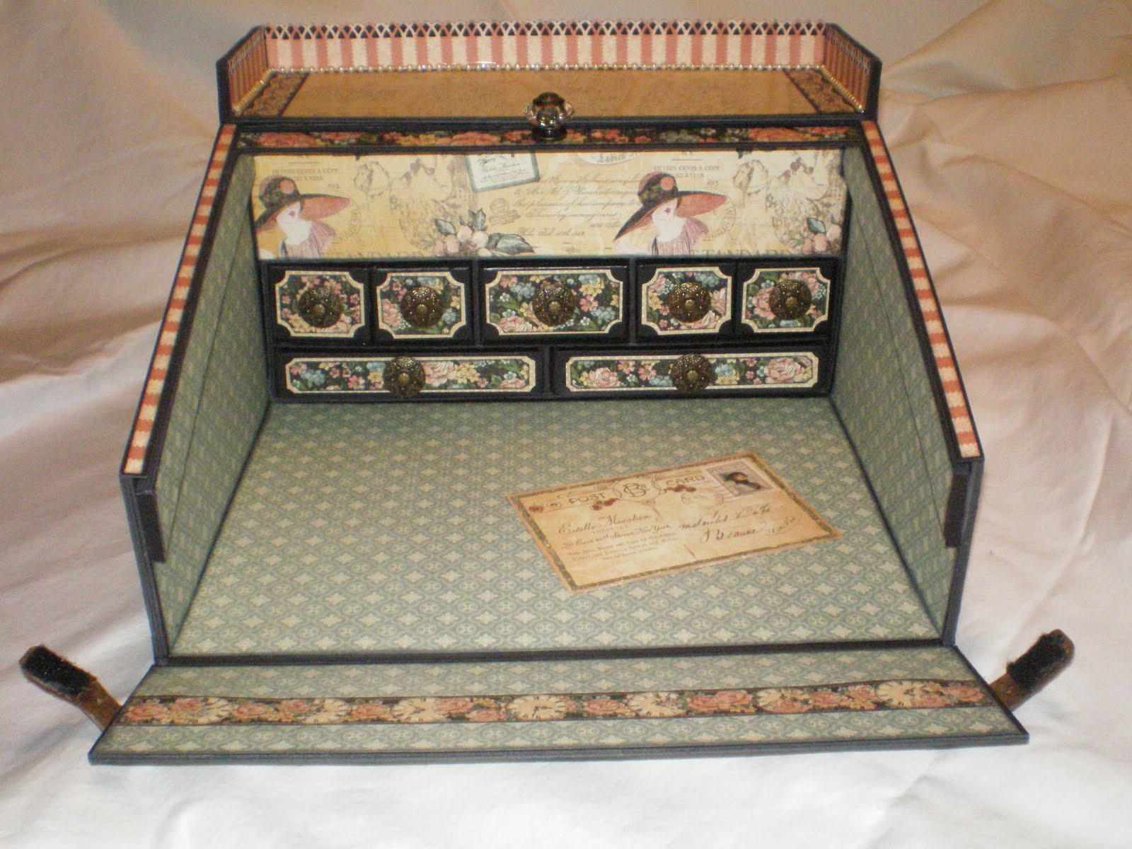 A few months back I was viewing Jim, The Gentleman Crafter’s blog when I saw the most beautiful creation – it took my breath away! Jim had created for Graphic 45’s A Ladies Diary paper line a lap/traveling writing roll top desk and Graphic 45 was giving it away (unbelievable)!!!! I immediately posted a loving comment & kept my fingers and toes crossed that I would be the lucky winner . . . well you guessed it, they picked someone else (even though I really believe to this day that they misspelled my name – LOL). . . However, all was not lost, Jim must have heard the million of anguished cries that went out into the universe and he took pity on us and did a tutorial on his roll top desk, which I immediately purchased (YAY) . . . LOL — I know you can’t see it but I have a BIG smile on my face just remembering my excitement on getting this tutorial . . . Soooooooooo without further ado, here are some pictures of the Ladies Roll Top Desk I made using The Gentleman Crafter’s tutorial . . .