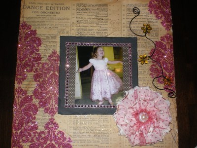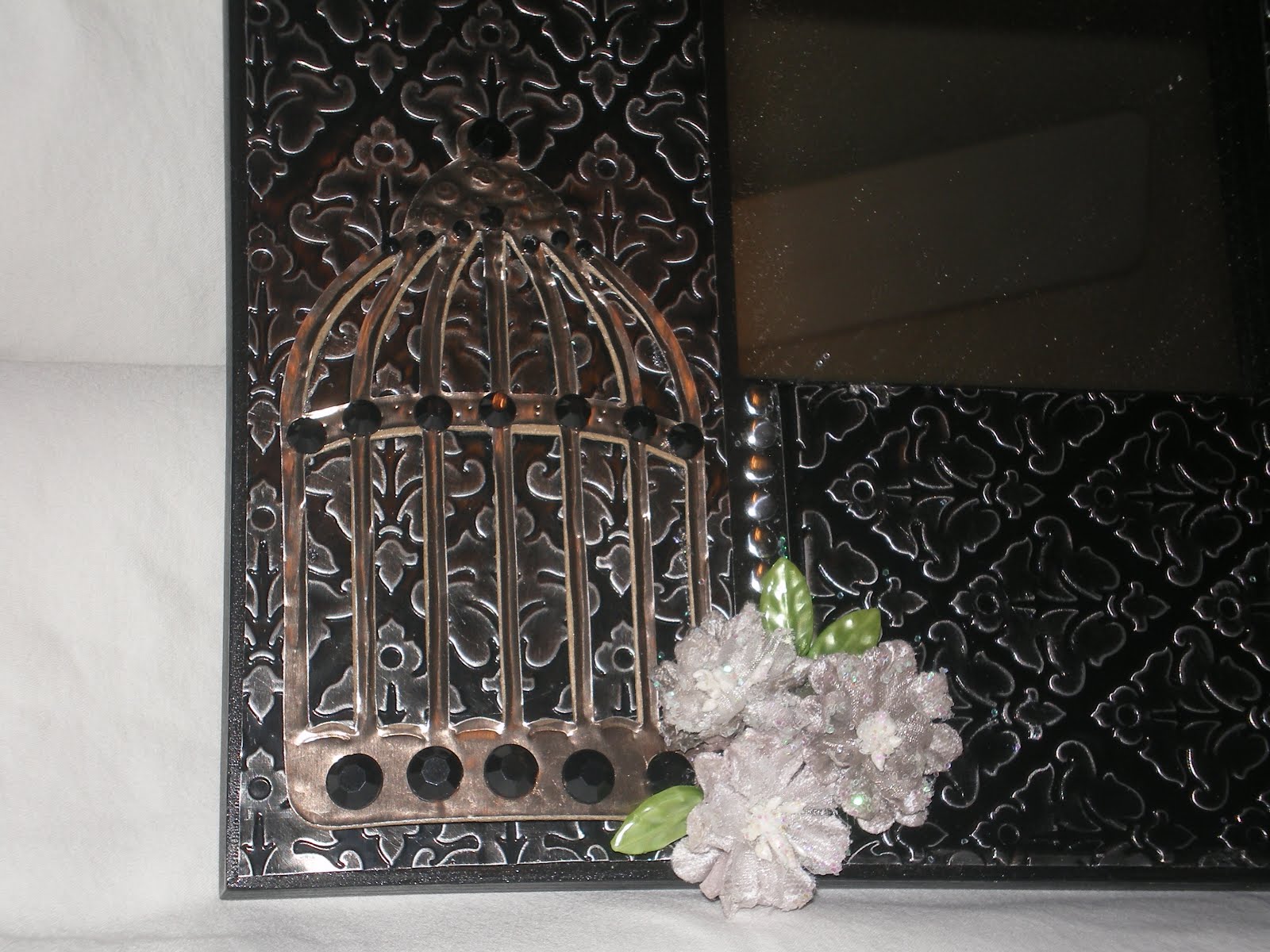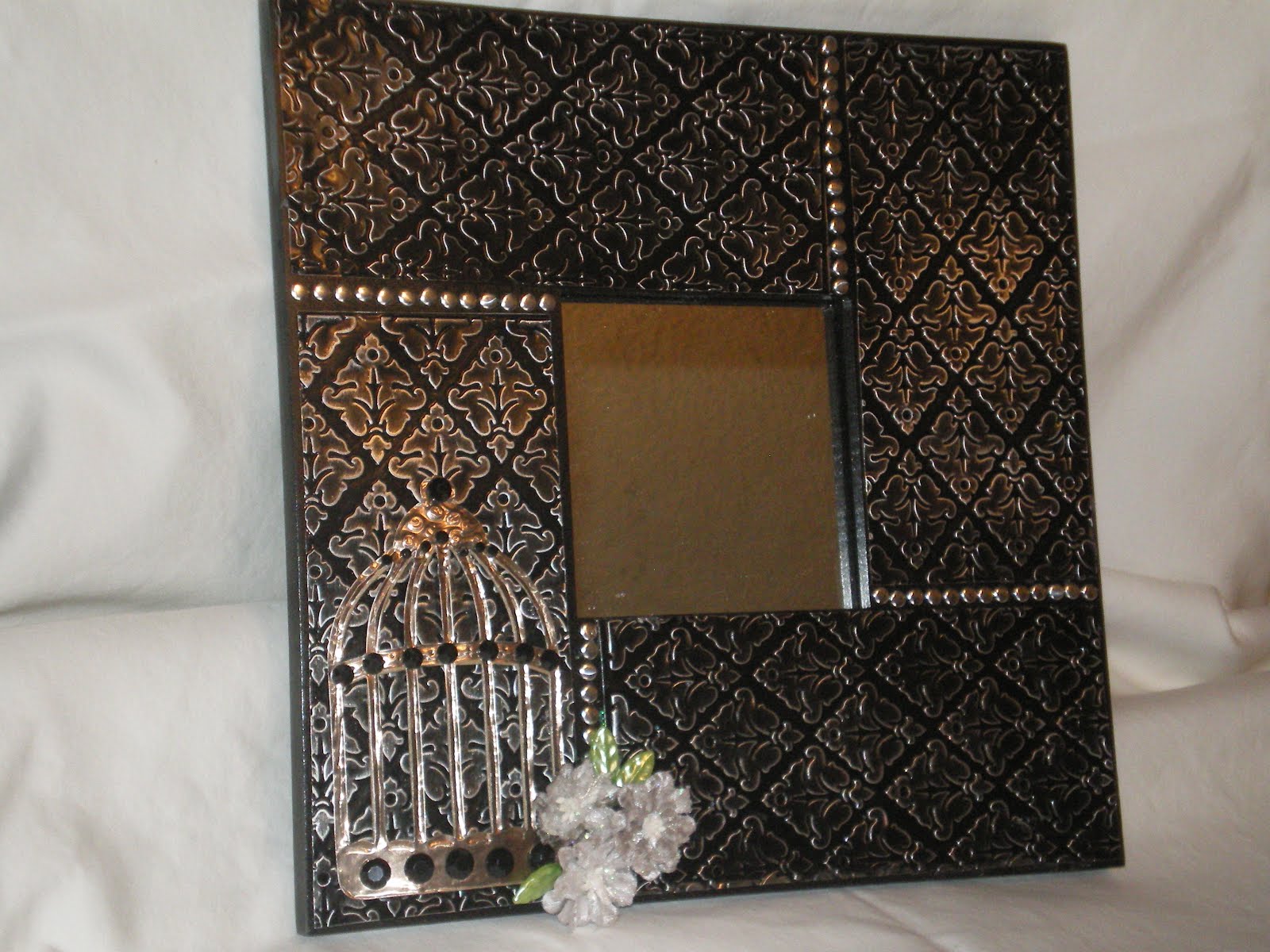 When I saw the sample for this layout I knew exactly what picture I was going to use . . . this is my granddaughter, Kyra, when she was 4 years old warming up for her very first ballet performance! . . . she loves to dance! Before you knew it, it was time for me to go to the class I signed up for – “Wood & Metal Embossed Mirror” . . . here is a picture of the finished project I completed after I got home (as always, I did make a few changes to the original design-LOL) . . .