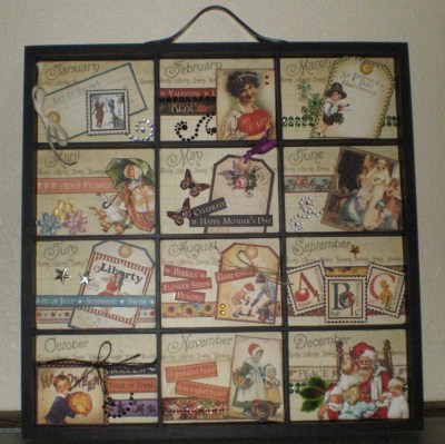 Well, we have finally had a rainy Saturday here in northern California. I don’t mean one of those rains with just a few sprinkles here and there, you know the kind of rain that leaves just enough drops on your car to let you know that it’s dirty and needs a good wash and wax (LOL). . . no, this was the kind of rain that made you turn your windshield wipers on high and drive cautiously on the highway . . . Now, I know you are wondering what could be happening to make me go out in this down pour instead of making a big pot of soup, curling up with a hot cup of tea and watching trashy Saturday movies on television while hubby was doing his thing in the garage . . . well I will tell you . . . it was the Paradise Scrapbook Boutique Annual Gift Workshop . . . I made a number of purchases (thank you again hubby for the great birthday gift certificate)and spent this windy, wet day among friends, old & new . . . at the end of 6 hours (LOL-I am finding it hard to multi-task anymore – love to eat & visit while I work) I had completed a beautiful kit created by PSB owner, Karen . . . it is a Shadow Box Monthly Calendar . . .
