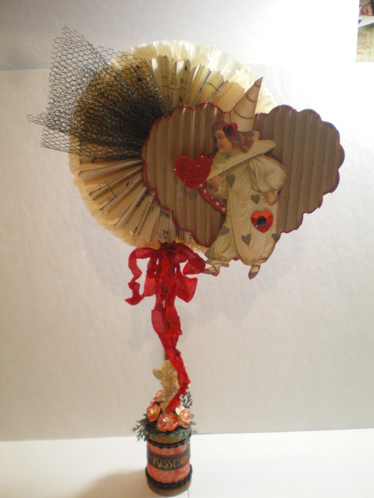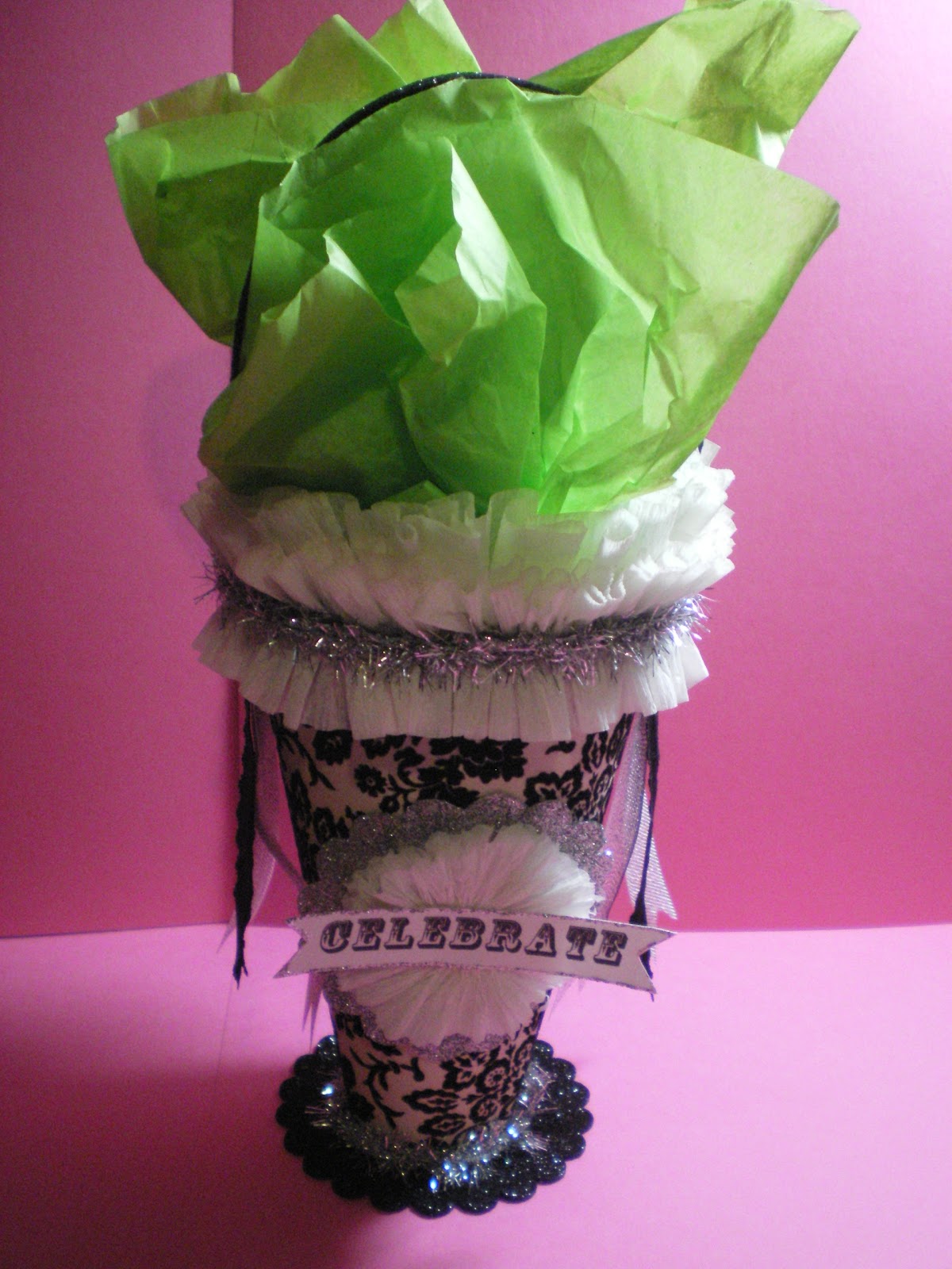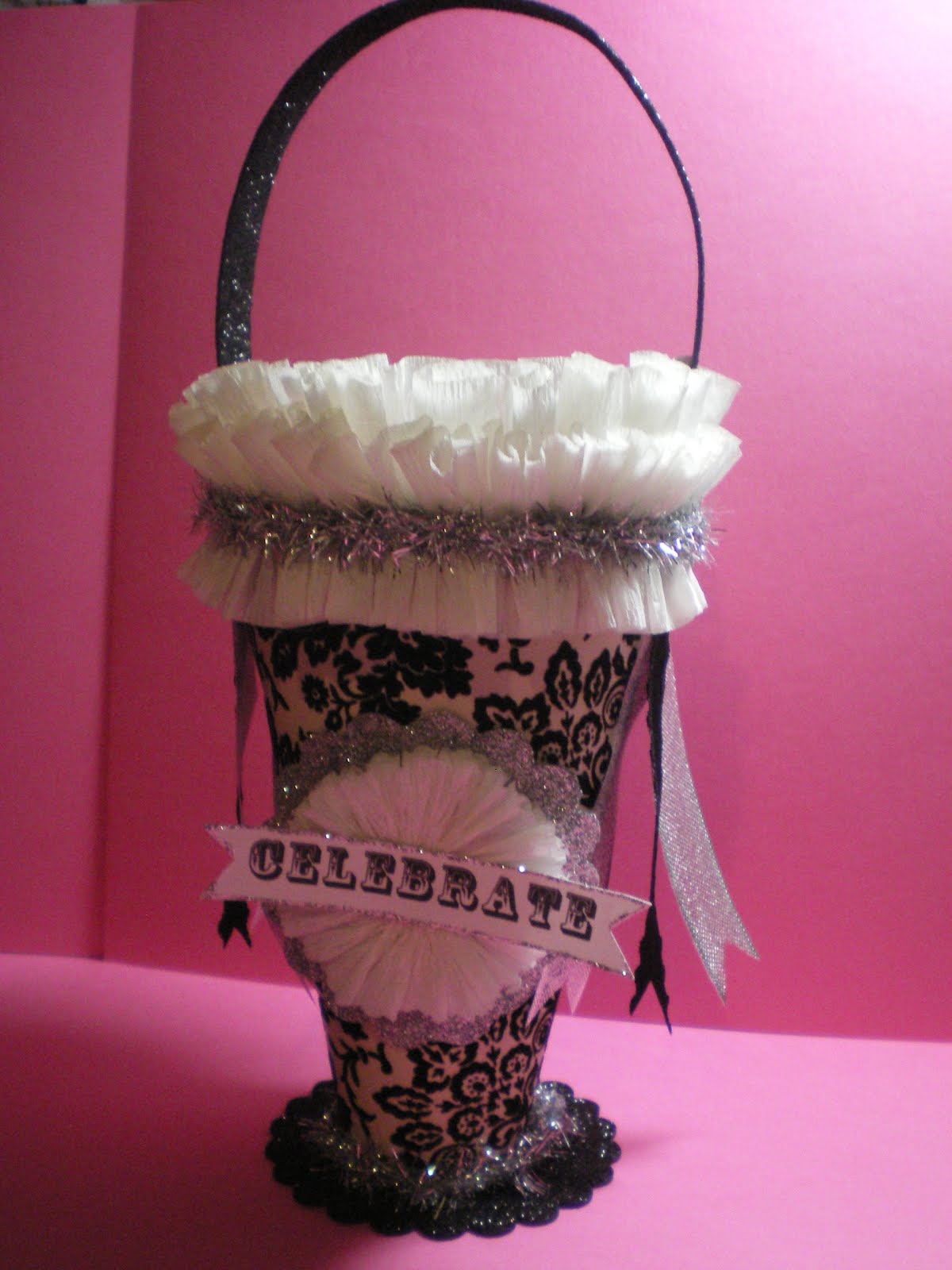 Now I probably saw an example of this somewhere on the internet and I am sorry to say that I don’t remember exactly when or who made the original (even though I am pretty sure it was Karin of Creative Chaos – I love her blog) . . . anyhooooooo, I made this container by covering up a purchased paper cone with some scrapbook paper from my stash (wish I knew the name of the is paper as I would love to get more, that is even if they make it any longer-LOL), gathered strips of crepe paper (did this by hand while watching the SJ Sharks win another hockey game – YAY), found some silver tinsel and ribbon in my stash, cut out scalloped circles with my Cricut and went on a Martha Stewart glitter frenzy (glitter everywhere and I mean everywhere!) . . . it is any easy peasy project . . . Well, that’s all for now . . . thanks for stopping by and until next time . . . Hugs & Kisses . . . LindaB