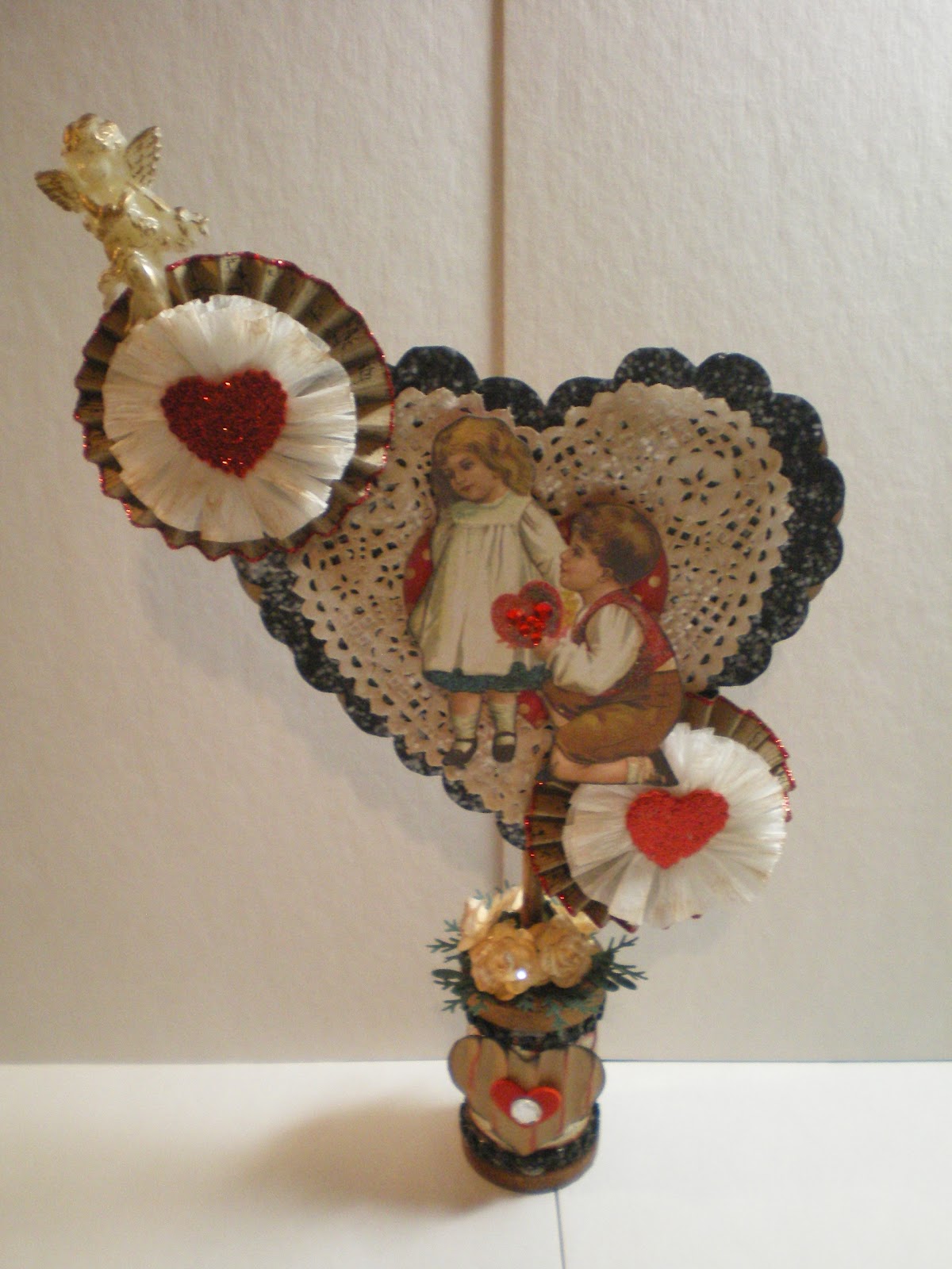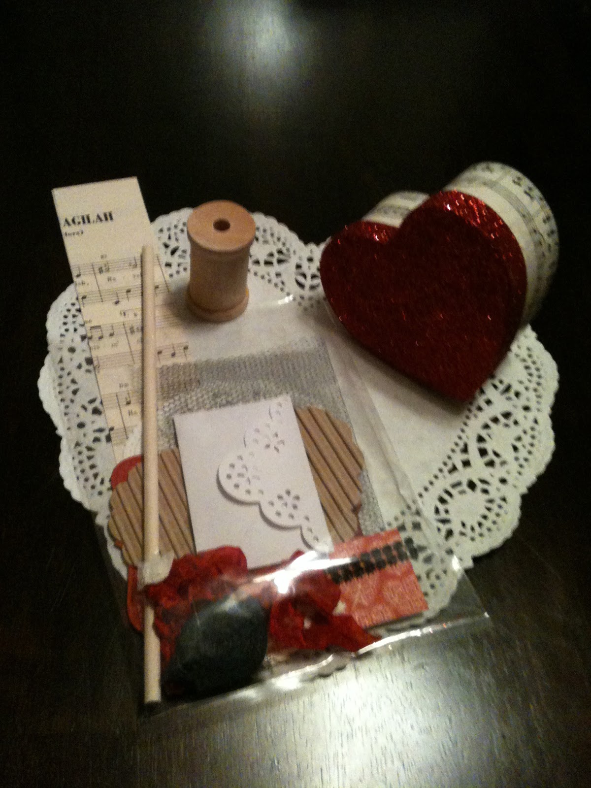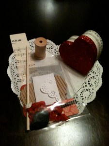 Good Morning . . . I want to wish everyone a JOYOUS & HAPPY VALENTINE’S DAY and I want to share with you today some valentine “lollies” I made. Last Saturday I spent a wonderful day at Paradise Scrapbook Boutique’s annual Valentine crop . . . you know where you visit a lot, eat way too much food and get some scrapping in (very little scrapping on my part as I am busy visiting – LOL) . . . at each assigned seat was this little stack of goodies waiting for us.