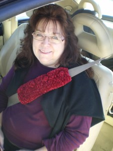 . . . TADA . . . it’s a SEAT BELT SNUGGLE and it is being modeled by the lovely birthday girl herself, Diana Higgins!!! I know you are saying to yourself “what the heck” but we short people have a terrible time with seat belts rubbing against our necks and these little cozies are an answer to our prayers . . . they also keep that side of the neck warm (hahaha). I found the free pattern for this little jewel back in 2006 on the internet (tried to link it to this post but apparently the site no longer exists). . . so now I am off the take pictures of some valentine lollies I made . . . Thanks for stopping by and until next time . . . Hugs & Kisses . . . LindaB