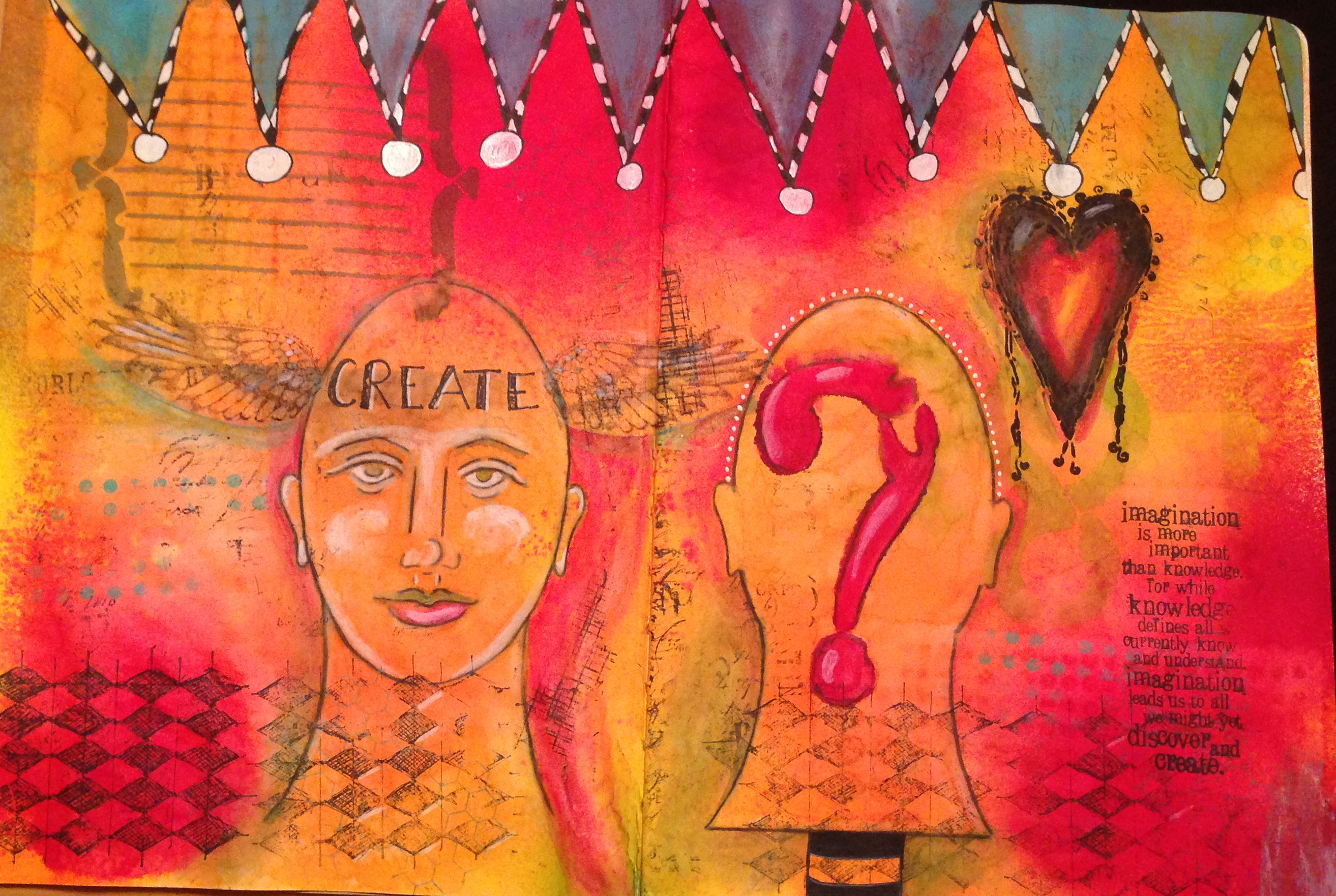 Supplies Used for Mixed Media: Dylusion Ink Sprays, Tim Holtz stamps (papillon, mixed media), Pam Carriker stamps (sketched harlequin, I will soar small wings, columns of dots), Pam Carriker stensils (large face map, large and & question mark, small my heart), Stampin’ Up pencil, Uni-ball Sigro white pen, Uni-ball vision elite black pen, Ranger Archival ink pads, Color Box chalk ink pad, Tim Holtz frosted film, Faber-Castell Gelatos, white acrylic paint.